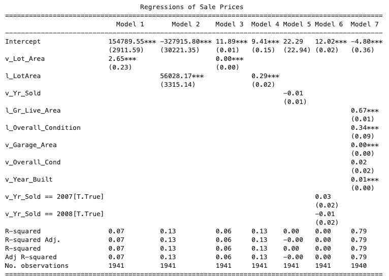 This Project aimed at analyzing the regression analysis of Housing data from 2006 to 2008. Using the v_Sale_Price, Sale Price of the given parcel, against multiple variables including Lot Area, log(Lot Area), Year Sold, and others, this report analyzes coefficients that were found after runnign the regression. This report also created 7 models to base the regression off of.